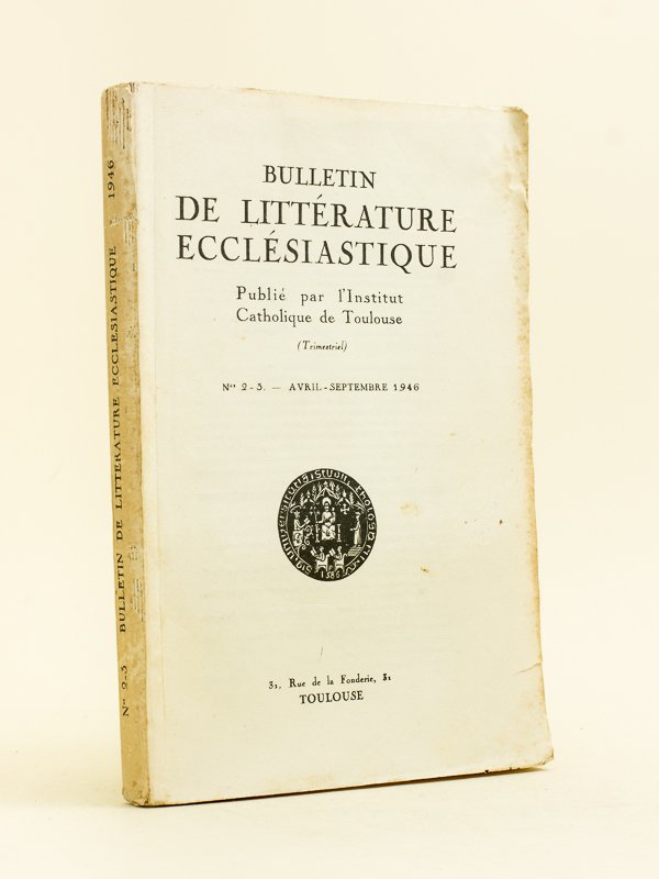 Bulletin de Littérature Ecclésiastique publié par l'Institut Catholique de Toulouse (Année 1946 - Numéros 2-3 : avril - septembre 1946 ) [ Contient : ] Le portail de Moissac non compris et méconnu (Saltet) ; Humanisme de Claudel (Decahors) ; Les maîtres modernes du droit naturel, Taparelli d'Azeglio (Noubel) ; Le document Newman-Perrone et le développement du dogme (Cavallera) ; Qui rédigea l'encyclique "Pascendi" ? (Jean Rivière)