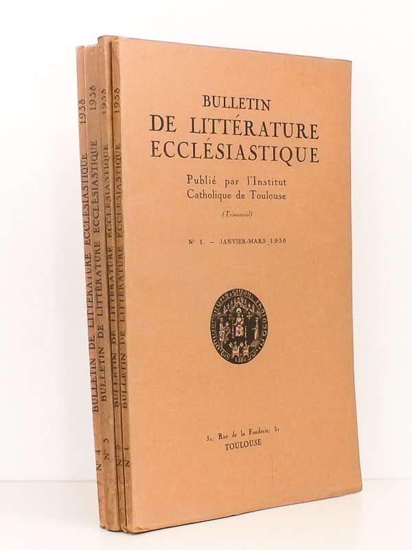 3 fasc. in-8 br., Bulletin de Littérature Ecclésiastique, Institut Catholique de Toulouse, Toulouse, 1939 , 179 pp. + CVI pp. de chroniques de l'Institut. Bon état. Prix pour l'ensemble. Peu courant.