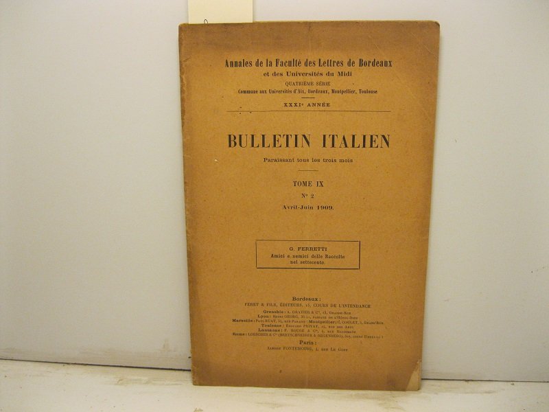 Bulletin italien paraissant tous les trois mois. Tome IX, no 2, Avril-Juin 1909. Amici e nemici delle raccolte nel Settecento