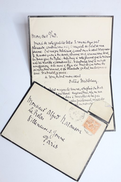 s. l. • [cachet de Seine-et-Marne] 15 Septembre 1901 | 12.50 x 17.60 cm | une feuille | [ENGLISH DESCRIPTION ON DEMAND] | Emouvante lettre autographe signée d'Octave Mirbeau, adressée au dramaturge et fondateur de la Revue Blanche, Alfred Natanson. 15 lignes à l'encre noire sur un feuillet remplié, papier de deuil à encadrement noir, filigrané JDL & cie, enveloppe jointe. Merci de votre gentille lettre. je savais déjà par Alexandre [Natanson], combien vous aviez été inquiets de l'état de ma femme. C'est une joie délicieuse quand on a le cœur tourmenté, de savoir qu'on a des amis comme vous, comme vous tous, les braves gens du Relai. Dites bien à votre femme que la mienne a été très sensible à son amitié. Et embrassez tout le monde avec effusion. Dites aussi à Olga [femme d'Alexandre Natanson] et à Misia [femme de Thadée] que nous les aimons tendrement, et à Alexandre, qu'il est un charmant ami. Long post scriptum sur la mauvaise santé de son épouse, l'ancienne comédienne Alice Régnault : La journée d'hier n'a pas été bonne, et la plaie du bras présentait un aspect méchant. Aujourd'hui cela va un peu mieux. Mais c'est une chose à surveiller de très près. Les mouvements se font un peu plus facilement mais elle souffre toujours extrêmement la nuit, au moindre jeu des muscles. Mirbeau a été particulièrement proche du groupe de la Revue Blanche, depuis le lancement de celle-ci à Paris en 1891. Mais c'est depuis l'affaire Dreyfus que s'est renforcée son amitié intime et durable avec les frères Natanson, Thadée, Alexandre et Alfred. Après des divergences de vue esthétiques sur l'Art Nouveau et les Nabis, Mirbeau retrouve finalement Thadée autour de 1900, dans une inclination désormais commune pour les jeunes peintres Nabis de la Revue Blanche, Bonnard, Vallotton et Vuillard. Le Relai correspond à un ancien relais de poste à Villeneuve-sur-Yonne acheté par Thadée Natanson en 1897 qui devint une destination pour tous leurs amis écrivains et artistes. On y croisait les peintres Nabis, Vuillard, Valloton, Bonnard ou Roussel ainsi que Toulouse-Lautrec. La Revue Blanche a joué un rôle essentiel en France, c'est ce que confirme l'historien Paul-Henri Bourrelier : La plupart des écrivains, peintres, musiciens, hommes politiques, intellectuels les plus marquants de la fin du XIXe et du début du XXe siècle y ont collaboré ou l'ont côtoyée. Créée, financée et dirigée par les trois frères Natanson, jeunes Juifs polonais, avec la complicité enthousiaste de leurs condisciples du lycée Condorcet, La Revue blanche devient vite un lieu de débat sur tous les sujets qui agitent la France. Elle mène des combats politiques sous l'impulsion d'anarchistes comme Fénéon, Mirbeau ; de socialistes, tels Blum, G. Moch, Péguy ; de dreyfusards et de fondateurs de la Ligue des droits de l'homme, comme Reinach et Pressensé.