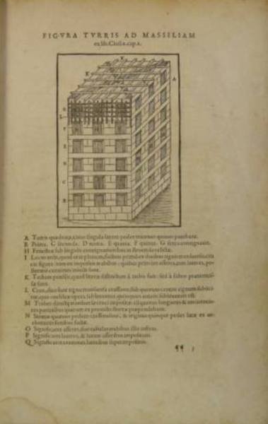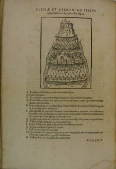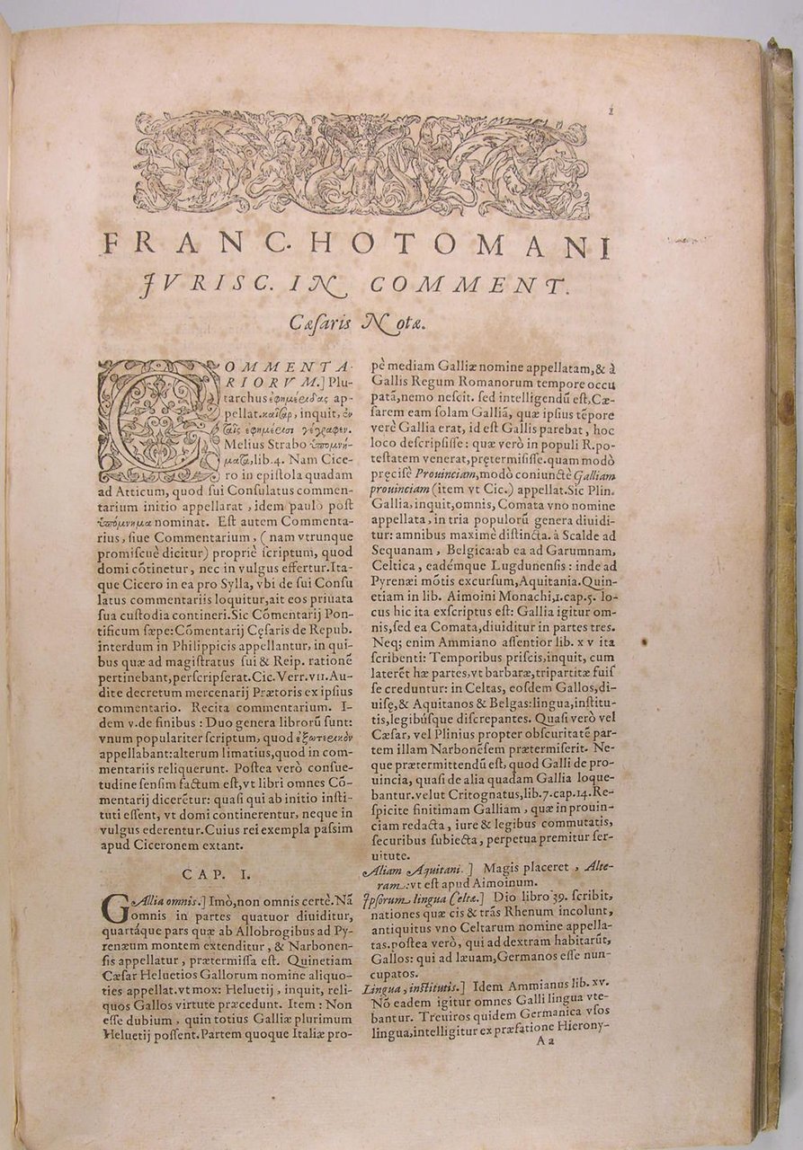 Lugduni, Bartholomaeum Vincentium, 1574. Grand in/4 (31 x 21 cm) reliure plein velin, bandeaux, lettrines historiées, culs de lampes, 11 vignettes (bois) in-texte, 8 ff., 213 pages, (Franchotomani) : 173 pages, 10 ff. Dos renforcé également avec du velin. Auréole en base des 8 premiers feuillets ; quelques rousseurs et feuillets oxydés. Belle typographie, calligrammes en fin de chapitres. Adams page 220. La Guerre des Gaules ou Commentaires sur la Guerre des Gaules (en latin Commentarii de Bello Gallico) est un ouvrage d'histoire en sept livres de Jules César constitué de notes rédigées au fur et à mesure de la guerre et rassemblées vers 52-51 av. J.-C. dans lequel il relate ses opérations militaires lors de la Guerre des Gaules qui se déroula de 58 à 52 av. J.-C. et dont il fut le généralissime victorieux. Un huitième livre écrit plus tard par Aulus Hirtius décrits des derniers combat de 51 av. J.-C. et la situation en Gaule en 50 av. J.-C.4to in full vellum ; head & tail-pieces, historical letters, 11 woodcuts ; [8], 21 p., Franchotomani : 173 p., [10]. Few flaws : spine strengthened with vellum too ; waterstain on lowerborder of the 8 first sheets ; some foxing and oxidized sheets. Fine typography. A very good copy.