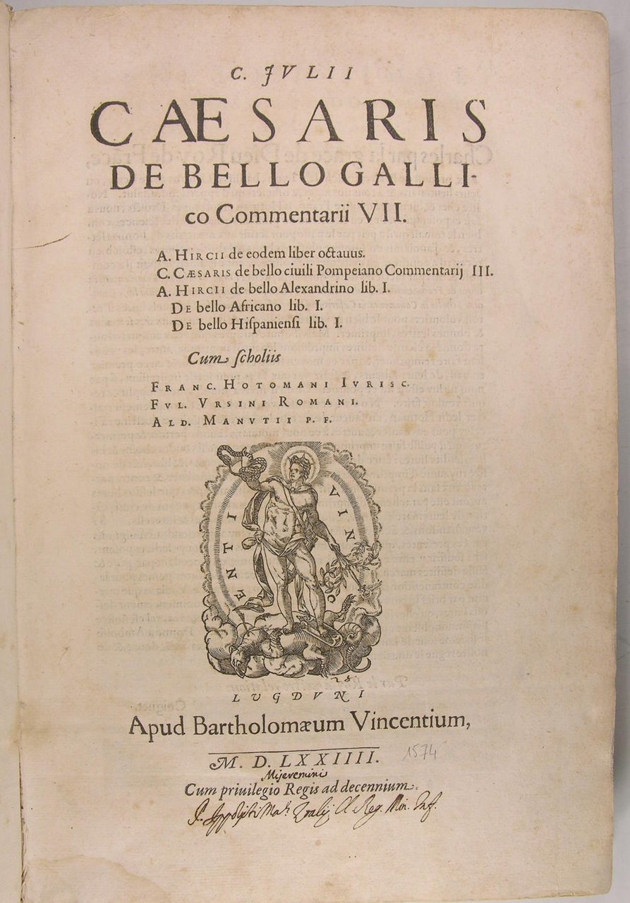 C. Julii Caesaris de Bellogalli co Commentarii VI. A. Hircii de eodem liber octauus. C. Caesaris de bello ciuli Pompeiano Commentarij III. A. Hircii de bello Alexandrino lib.I. de bello Africano lib.I. De bello Hispaniensi lib.I.