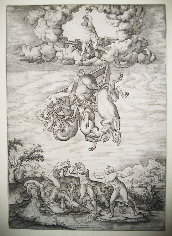 Burin, (417x294 mm. Signed in the center of the lower margin ''Mich. Ang. Inv.n. Beatrizet. Lotar. Restituit'', monogram ''A.L.F.'' on the left. Beautiful Michelangelo-inspired etching depicting The Myth of Phaeton from Ovid's Metamorphoses. The upper part shows Zeus hurling the thunderbolt to punish Phaeton, in the center the chariot with the four horses that are stumbling lost in the air, and Phaeton about to fall. At the bottom there are two women, the Eliad sisters, who noticing the boy's fall are in despair looking up at the sky, and a male figure lying down, this is the river deity Eridanus (the Po river), into which Phaeton is about to fall. Ferrario. Classiche stampe, p.30.