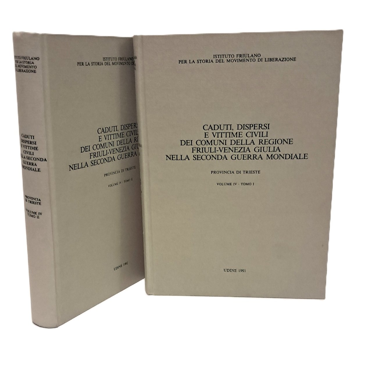 PRIMA EDIZIONE in due volumi, opera pubblicata con il patrocinio della Regione Raccolta in ordine alfabetico che comprende i dati relativi ai caduti, dispersi e vittime civili dei comuni della provincia di Trieste nella seconda guerra mondiale, la cui data di morte certa o presunta, in guerra o per cause di guerra, è compresa entro il 31.12.1954. Copertina cartonata e cofanetto. Pp. 814. Ottime condizioni.