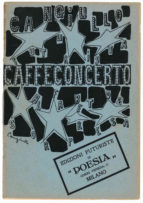 252×175 mm. [48] pp. Original side-stapled printed wrappers. A nearly perfect copy. An extraordinary artist's book composed as if it were a variety show, with an introductory set of fake advertising posters and a program divided into two parts for a total of 16 stage moments, created using an uninhibited and unrestrained design where letters are shaped and distorted to outline figures and profiles. All printed on pages of different colors. Unanimously recognized as one of the greatest masterpieces of Futurist “parolibera” art. “Nella storia letteraria, non solo italiana, del secolo, Francesco Cangiullo rimarrà protagonista e innovatore di primissimo piano per quattro tappe fondamentali, tre poetiche ‘Piedigrotta', ‘Caffèconcerto', ‘Poesia pentagrammata', di fondamentale peso per lo sviluppo della poesia sia visuale che sonora, e una teatrale in collaborazione con Marinetti, il ‘Teatro della sorpresa' ” (A. Lora Totino, Francesco Cangiullo, Turin, 1979). Salaris, Storia, p. 106; Cammarota, Futurismo, 76.14; Fanelli & Godoli, Il futurismo e la grafica, p. 58, nos. 27-38; Lista, Le Livre futuriste, nos. 218 and 294-301.