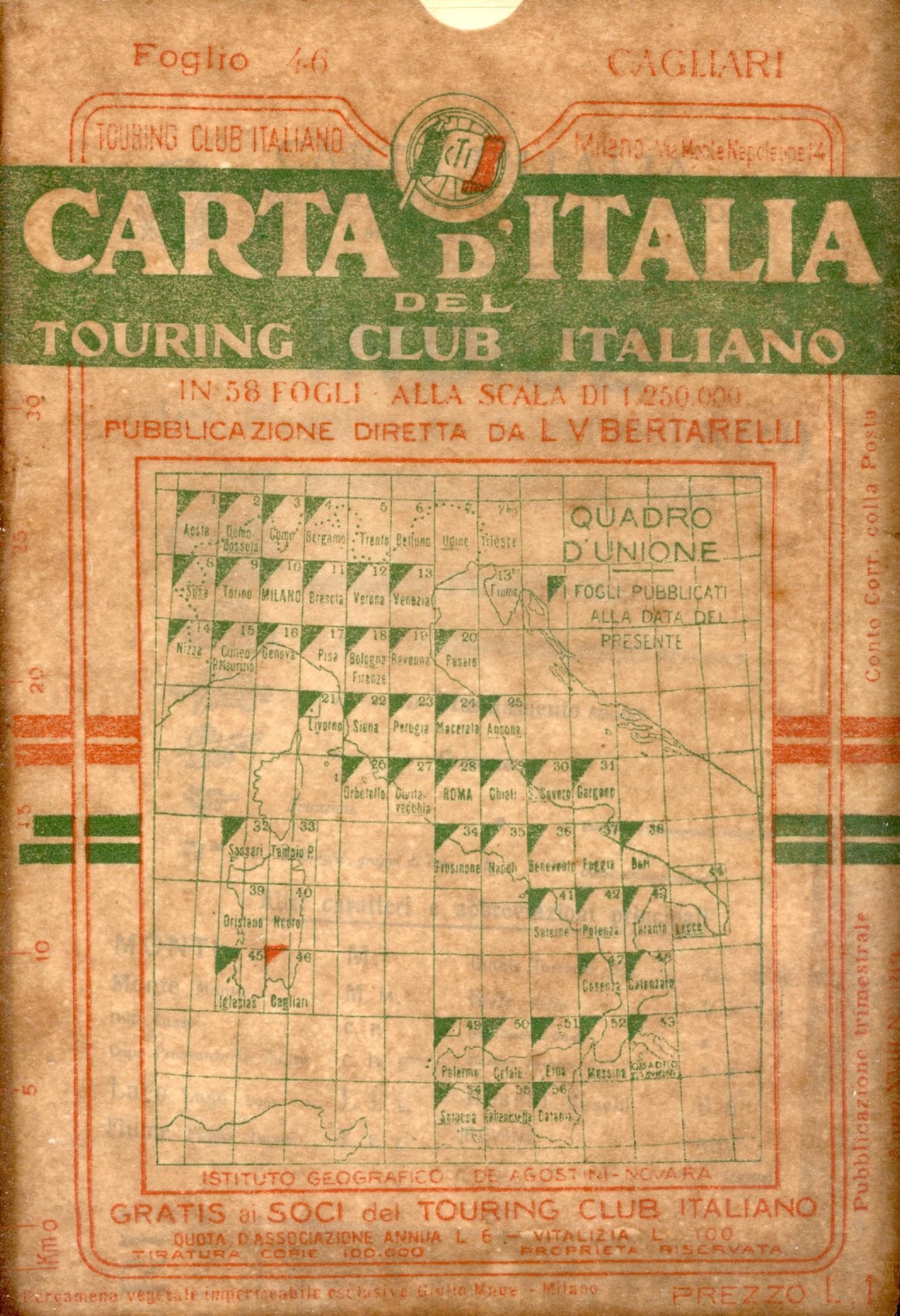Foglio 46 - Cagliari. Con custodia originale in pergamena vegetale. Allegato fascicolo con indice delle località contenute nella carta e legenda dei segni convenzionali. Stampa a colori. Scala 1:250.000. 914.5 - Ba Ottimo (Fine)