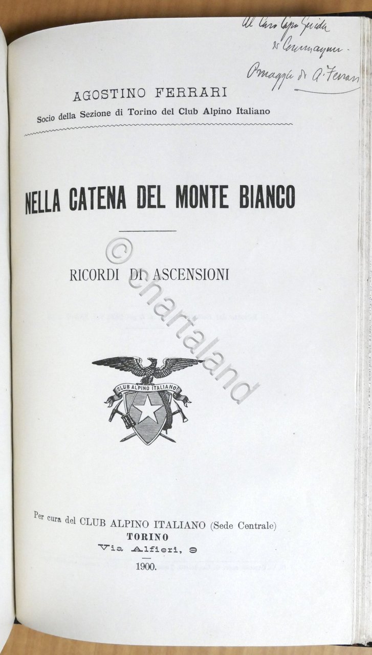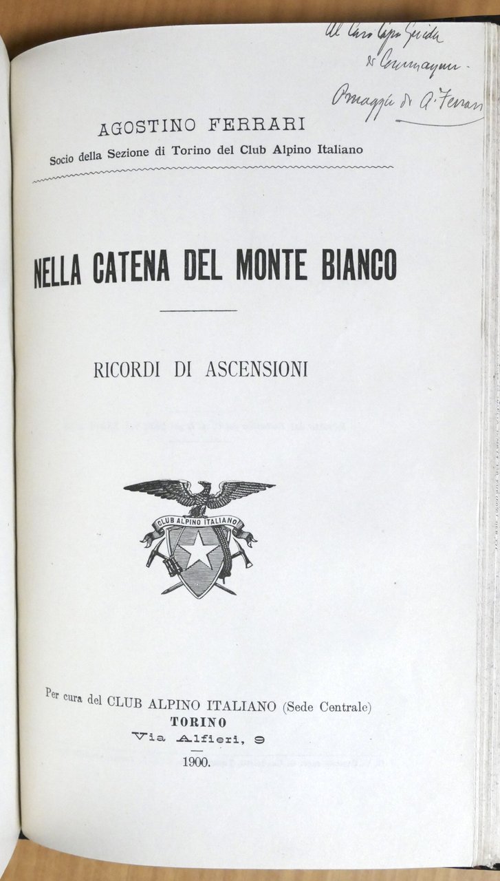 Alpinismo - C. Ratti - Club Alpino Italiano - Rivista mensile - Anno XIX - 1900 - completo Pag. 412 con illustrazioni. Rilegato Insieme a: Agostino Ferrari - Nella catena del Monte Bianco - Ricordi di ascensioni - 1^ ed. 1900, con dedica autografa autore Pag. 50 con illustrazioni. Copertina rigida - Testo in italiano. Condizioni molto buone.