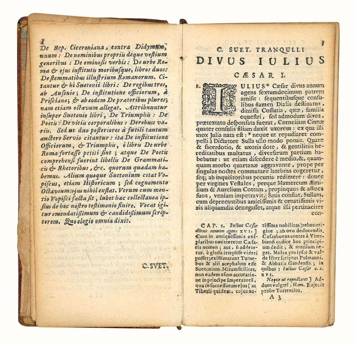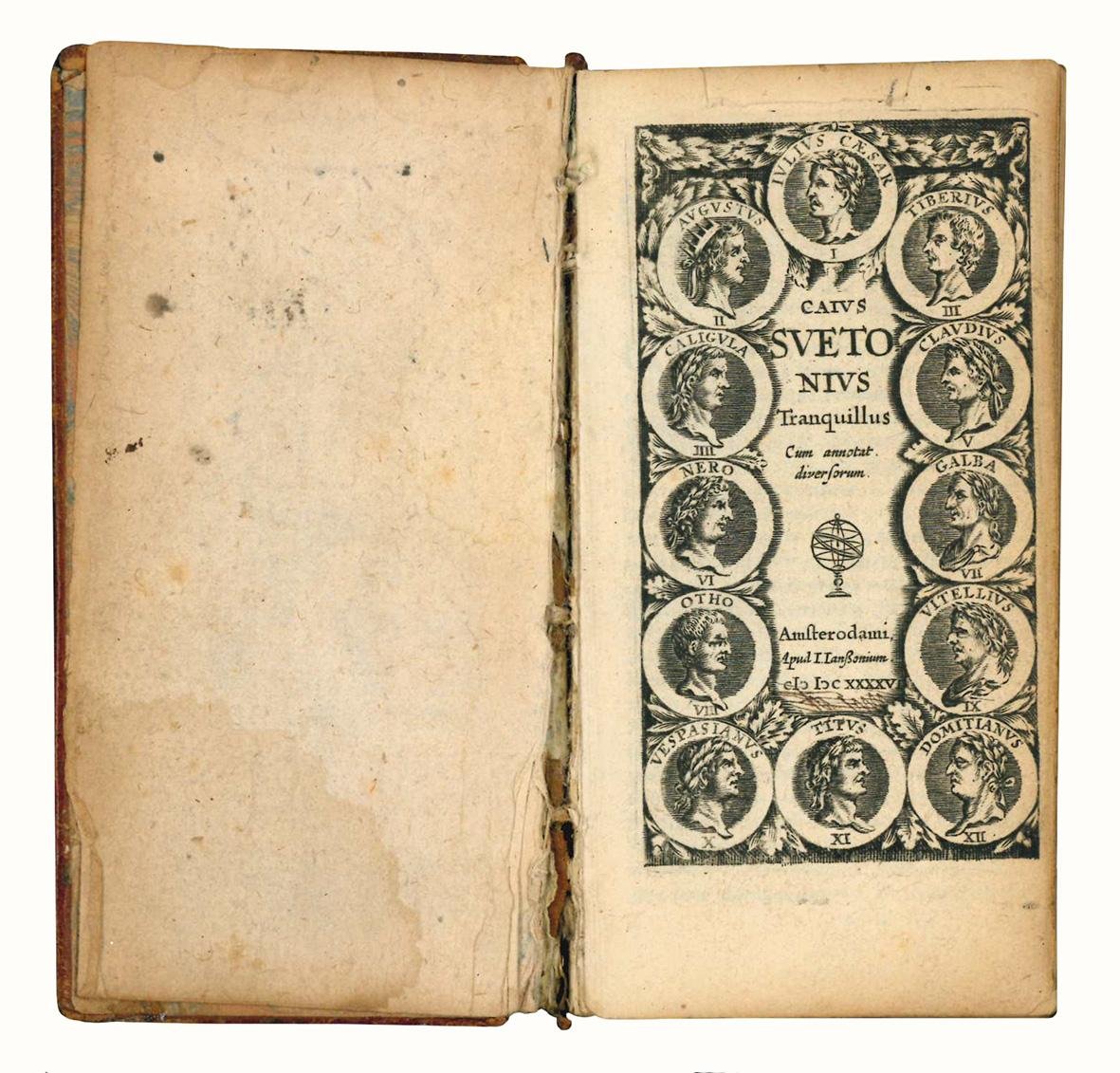 In 8vo (mm 113x57); pp. 397, [11]. Segnatura: A-Bb8 Cc4. Manca la carta Cc4. Frontespizio calcografico raffigurante i ritratti dei Cesari. Piccola mancanza al margine superiore del frontespizio, che tuttavia non interessa l'incisione. Primi fascicoli un po' sciolti. Bella legatura coeva in piena pelle, dorso e piatti riccamente ornati in oro. Dorso a quattro nervi. Taglio dorato. Piccole mancanze al dorso, cerniere un po' consunte.
