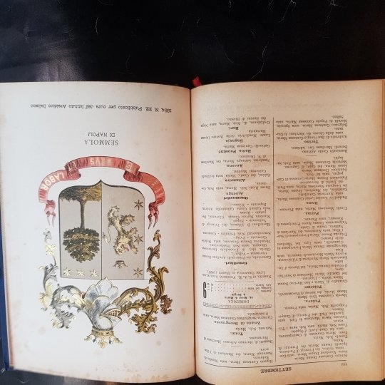 In-8° pp. XII,188, 90, (2), 239, (5), e 16 pp. di inserti commerciali su carta rosata. Con 5 tavv. di stemmi f.t. impressi in litografia, di cui 4 a colori, oltre ad alcuni stemmi nel testo. Tela editoriale con ricchi fregi in oro al piatto superiore e al dorso. Dedica manoscritta al frontespizio.