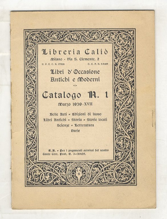 CALIÒ, Libreria. Libri d'occasione antichi e moderni. Catalogo n. 1. Marzo 1939-XVII. Belle arti, edizioni di lusso, libri antiche, storia, storie locali, scienze, letteratura, varie.