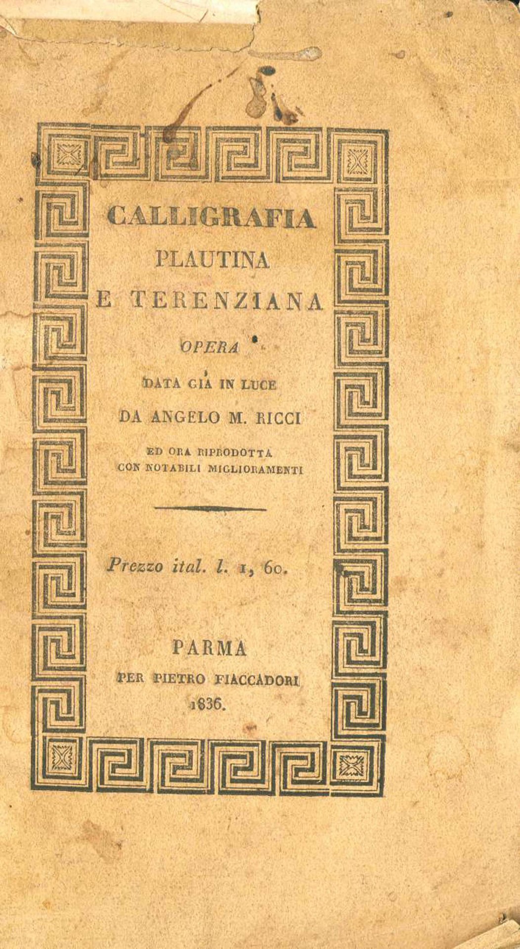 Calligrafia plautina e terenziana contenente le più pure e nitide locuzioni di latinità corrispondenti ad altrettante volgari disposte per alfabeto. Gore alle pagine. 870 � Ba Mediocre (Poor) Accettabile