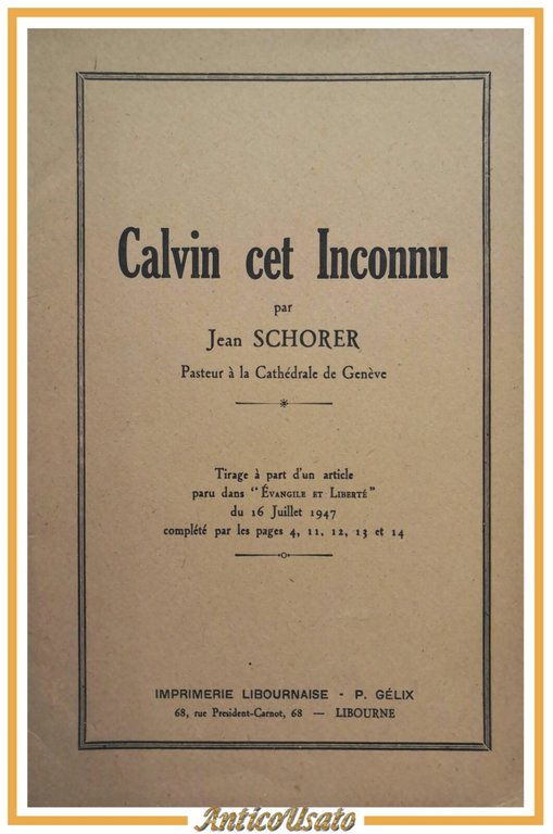CALVIN CET INCONNU di Jean Schorer 1947 imprimerie Libournaise Libro tirage part