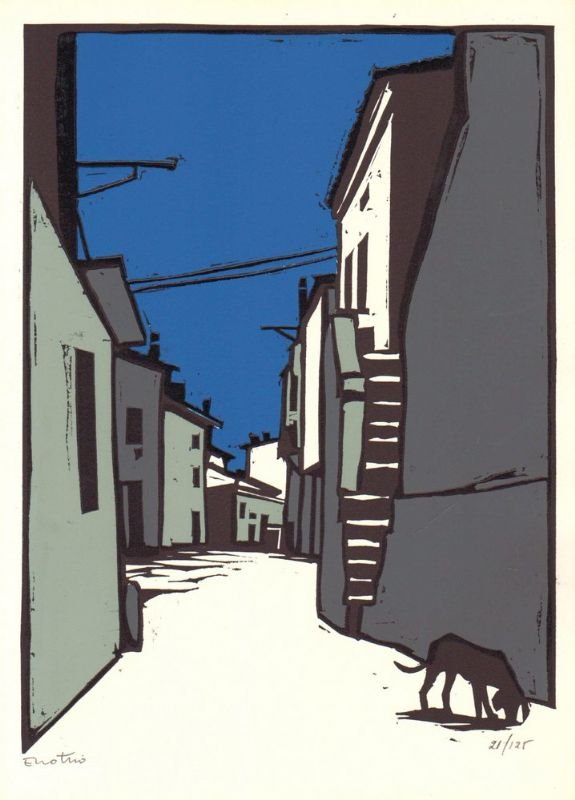 Cartella In-folio (cm 37 x 27), in cartonato marrone con marca editoriale impressa in bianco al piatto; contiene quattro bifolii sciolti, pp. non numerate (16), più la linoleografia a cinque colori di Enotrio, numerata (21/125) e firmata dall'artista, protetta da velina. Primo dei Quaderni dei Poeti Illustrati - bella edizione stampata a mano da Franco Riva in 125 esemplari, nella Primavera del 1966, alla memoria del Poeta, da poco scomparso. Il piatto anteriore della cartella è stato rinforzato alla cerniera interna; per il resto esemplare allo stato di nuovo. Francesco Antonio COSTABILE (Sambiase, 27 agosto 1924 – Roma, 14 aprile 1965) è stato un poeta ermetico italiano. Dopo aver conseguito il diploma di maturità classica, Costabile si iscrisse alla Facoltà di Lettere, dapprima a Messina e poi - dal 1946 - a Roma, dove si laureò con una tesi in paleografia. In questo periodo conobbe Giuseppe Ungaretti, suo professore di Letteratura Contemporanea e con lui instaurò un forte legame di amicizia. Costabile morì suicida il 14 aprile 1965, a quaranta anni, nella sua abitazione romana, per inalazione di gas. Enotrio Pugliese, meglio noto come ENOTRIO (Buenos Aires, 11 maggio 1920 – Pizzo, 21 agosto 1989), è stato un pittore italiano. Nasce a Buenos Aires da una famiglia calabrese emigrata in Argentina all'inizio del secolo. I suoi primi contatti con il mondo della cultura e dell'arte hanno luogo in un clima caratterizzato dalle relazioni che la famiglia (anche dopo il rientro in Italia nel 1926) ha con l'ambiente musicale. La sua prima mostra si tiene nel 1946 alla galleria 'Del Cortile' di Roma, che presenta una serie di disegni ad acquarello sulle Fosse Ardeatine. Enotrio è stato descritto in molte pubblicazioni e la sua eredità include documenti segreti, poesie e versi in dialetto di struggente bellezza. Fu un artista poliedrico che oltre a dipingere illustrò vari libri e scrisse un volume di poesie intitolato 'Fatti figuri e cosi calabrisi' edito dalle edizioni Carte Segrete. Fu anche un incisore che prediligeva la tecnica della xilografia. Dopo la seconda guerra mondiale ha frequentato lo studio del pittore Domenico Purificato e in seguito ha preso parte alle più importanti rassegne e premi nazionali. A lui Franco Costabile ha lasciato le sue ultime poesie prima di suicidarsi.