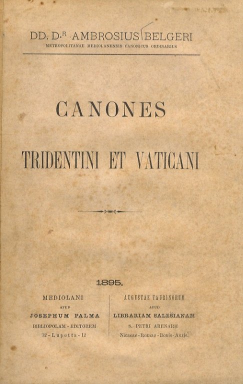 Mediolani-Augustae Taurinorum, Palma-Librariam Salesianam, 1895, in-8, brossura editoriale, pp. 624. Dorso fittizio con titoli calligrafati.