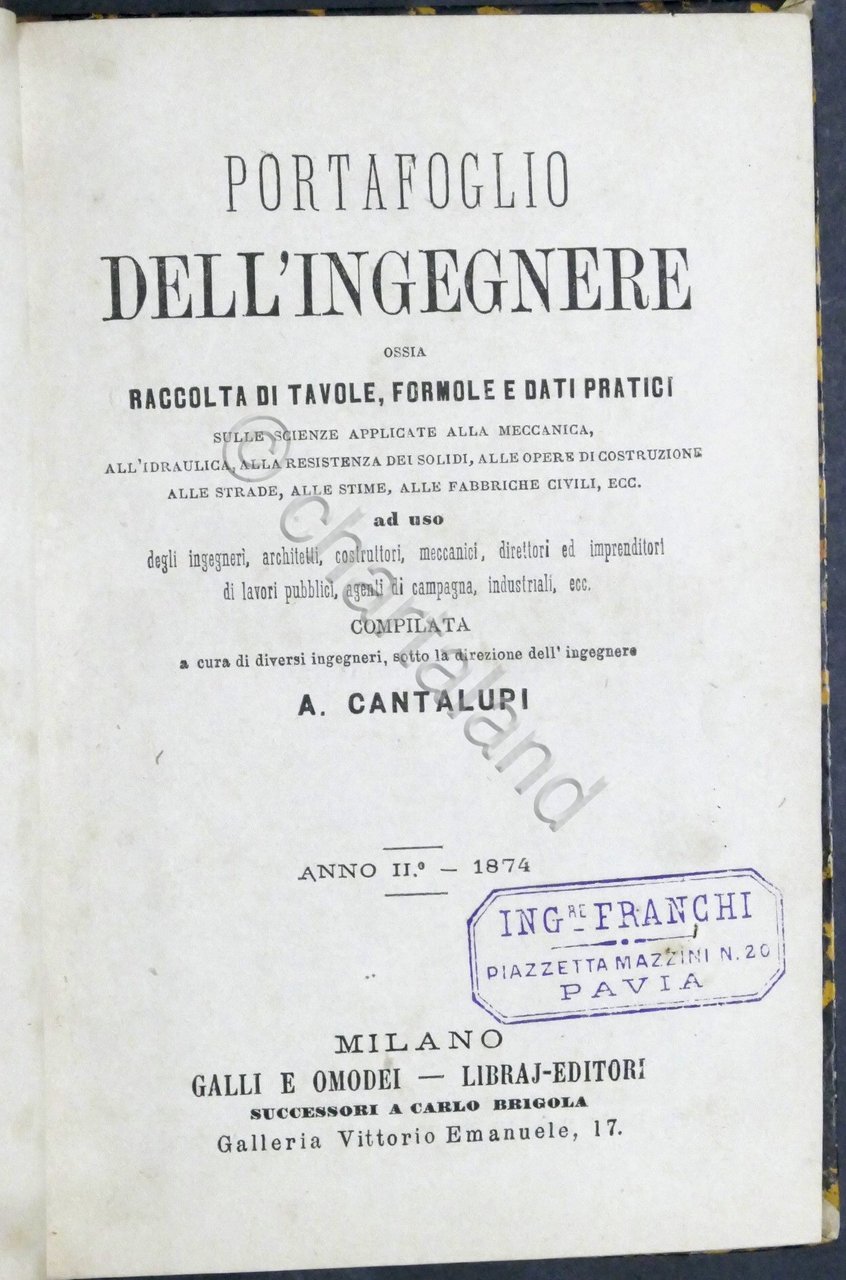 A. Cantalupi - Portafoglio dell'Ingegnere ossia raccolta di tavole, formole e dati pratici - 1874