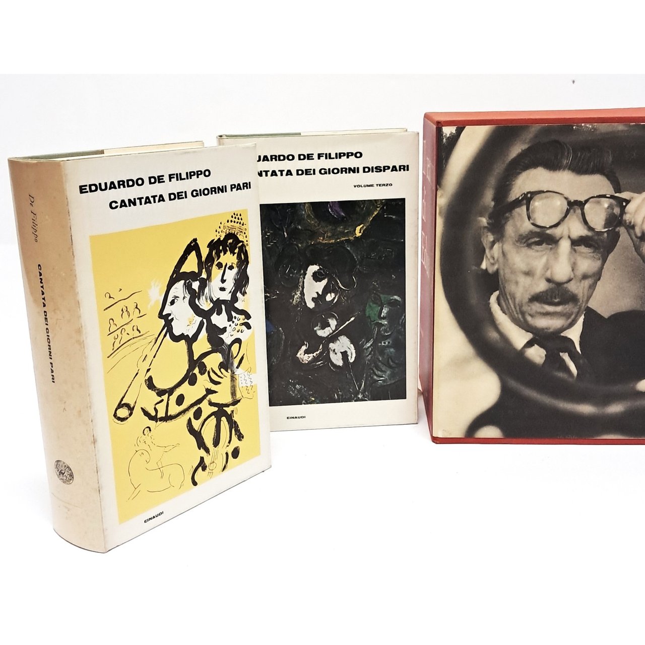 Ottava edizione, Opera in quattro volumi in cofanetto. La Cantata dei giorni dispari raccoglie le commedie che Eduardo De Filippo scrisse dal 1945, anno della pubblicazione di Napoli milionaria!, alla prima edizione della raccolta del 1966. In questo contesto i "giorni dispari" sono intesi come quelli negativi, a differenza dei "giorni pari", fortunati e felici. Sotto questo titolo di "cantata" vennero riunite quelle commedie che affrontavano i problemi legati alla realtà sociale italiana così com'era sopravvissuta dopo le distruzioni materiali e morali apportate dalla guerra. L'opera contiene: Volume primo Napoli milionaria! (1945) Questi fantasmi! (1946) Filumena Marturano (1946) Le bugie con le gambe lunghe (1947) La grande magia (1948) Le voci di dentro (1948) Volume secondo Non ti pago (1940) Occhiali neri (1945) La paura numero uno (1950) I morti non fanno paura (1952) Amicizia (1952) Mia famiglia (1955) Bene mio e core mio (1955) De Pretore Vincenzo (1957) Volume terzo Il figlio di Pulcinella (1957) Dolore sotto chiave (1958) Sabato, domenica e lunedì (1959) Il sindaco del rione Sanità (1961) Tommaso d'Amalfi (1963) L'arte della commedia (1964) Il cilindro (1965) Volume quarto Farmacia di turno (1920) Uomo e galantuomo (1922) Filosoficamente (1928) Sik-Sik, l'artefice magico (1929) Chi è cchiù felice 'e me!. (1929) Natale in casa Cupiello (1931) Gennareniello (1932) Il dono di Natale (1932) Quinto piano, ti saluto! (1934) Uno coi capelli bianchi (1935) L'abito nuovo (1936) Pericolosamente (1938) La parte di Amleto (1940) Io, l'erede (1942) Ditegli sempre di si (1932) Copertine cartonate con sovraccoperte illustrate. Pp. 533+527+515+637. Buone condizioni, normali segni di usura, molto modesti peraltro.