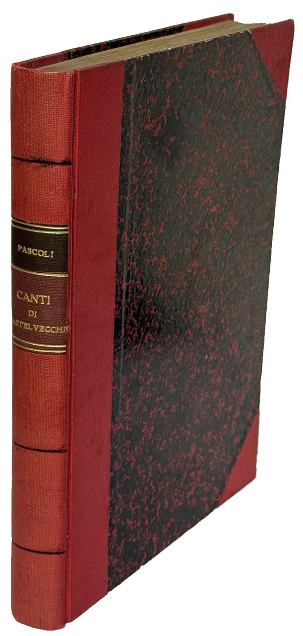 Mm. 214x150. Pp. XII, 210, [2 bianche]. Con un ritratto fotografico di Pascoli applicato al verso del titolo. Due bei capilettera e un finalino xilografico di De Carolis. Legatura coeva o di poco posteriore in mezza tela rossa con titolo in oro su tassello al dorso. Firma di possesso all'occhietto “I. Mazza” datata Maggio 1903. Sporadiche e lievi fioriture, peraltro esemplare ben conservato stampato su carta forte.