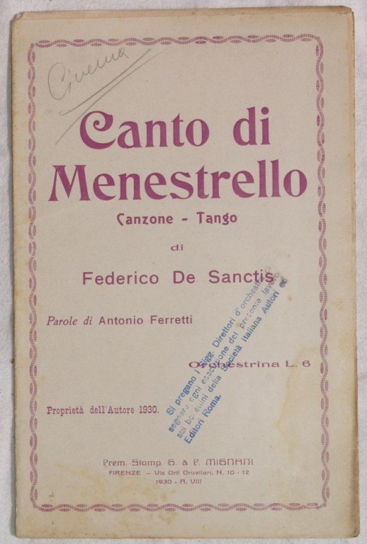 In 8. cm 27x17,5. Pp. 11. Partitura completa per orchestra del 1930. Caratteristica copertina decorata dell'epoca. Ottime condizioni. Ex libris sulla copertina. a complete score for orchestra of 1930. Carachteristic decorated cover of that period. Very good conditions. Ex libris in the cover.