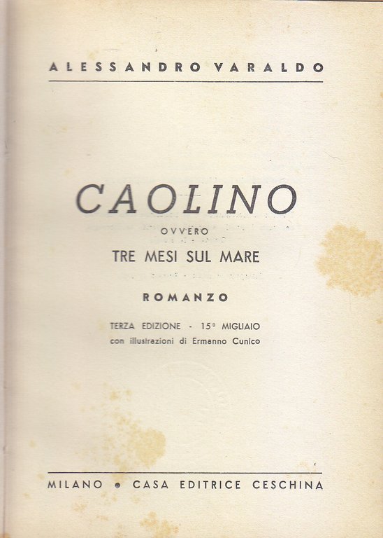 CAOLINO OVVERO TRE MESI SUL MARE di Alessandro Varaldo Ceschina III edizione, 1950. 238 Pagine, belle illustrazioni b/n nel testo e fuori testo di Ermanno Cunico. Copertina editoriale in tutta tela. Stato di conservazione: molto buono