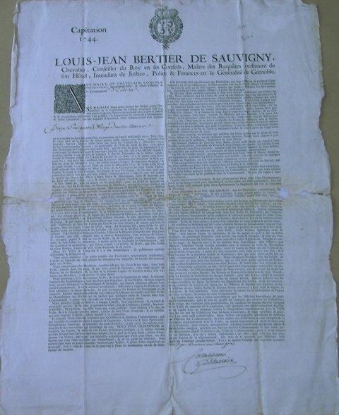 Affiche imprimé 60 x 44 cm, armes du Dauphiné, belle lettrine historiée, mentions manuscrites. Manques de papier au niveau d'une pliure ; renfort de papier au verso. Signature du chevalier Lius-jean Bertier de Sauvigny, long document sur deux colonnes.