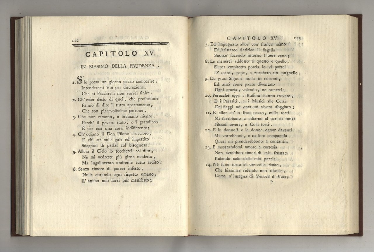 Utrecht [ma: Milano], a spese della Società, 1785, in-4, legatura moderna in piena tela, titolo in oro su tassello in pelle al dorso, pp. XII, 224. Prima edizione. Per l'autore, Francesco Carcano, cfr. Melzi, Dizionario di opere anonime e pseudonime di scrittori italiani, v. 1, p. 172. Esemplare nella variante principale descritta in ICCU. Dizionario Biografico degli Italiani Treccani: "Tra i suoi scritti, pubblicati con falsa indicazione del luogo di stampa, i Capitoli di un autore occulto (1785) costituiscono il contributo più spigliato che il C. abbia dato alla maniera giocosa".
