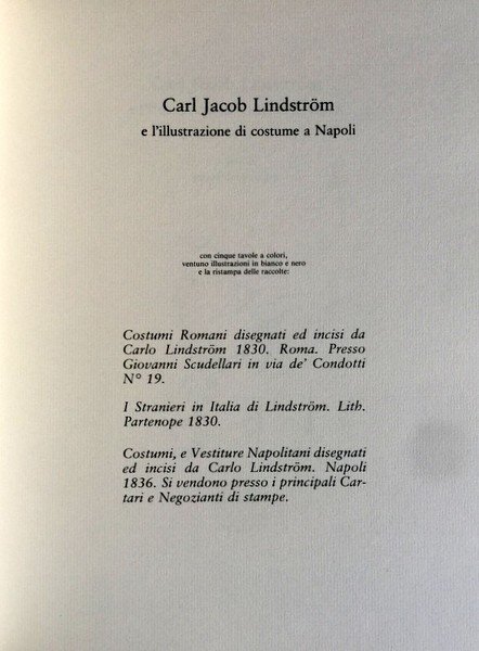 Ristampa delle seguenti raccolte: Costumi romani disegnati ed incisi da Carlo Lindstrom 1830. Roma. Presso Giovanni Scudellari in Via de’ Condotti 19; I stranieri in Italia di Lindstrom. Lith. Partenope 1830; Costumi, e Vestiture Napolitani disegnati ed incisi da Carlo Lindstrom. Napoli 1836. Si vendono presso i principali Cartari e Negozianti di stampe.