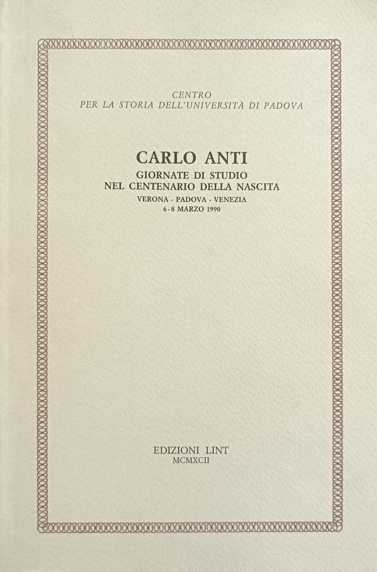 CARLO ANTI. GIORNATE DI STUDIO NEL CENTENARIO DELLA NASCITA. VERONA - PADOVA - VENEZIA. 6 -8 MARZO 1990