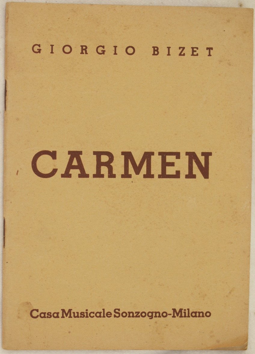 In 8. Dim. 19x13,5 cm. Pp. 48. Edizione del 1948 del libretto d'opera Carmen di George Bizet (1838-1875). L'opera venne rappresentata per la prima volta il 3 marzo 1875 dell'Opera Comique di Parigi.<BR>In ottime condizioni. Copertina editoriale in ottime condizioni generali con lievi usure ai margini e dorso (vedere foto). Legatura in buone condizioni. All'interno le pagine si presentano in ottime condizioni con rare fioriture. Edition of 1948 of this booklet Carmen by George Bizet (1838-1875).<BR>The work was represented for the first time the 3rd of march 1875 of the Opera Comique of Paris.<BR>In very good conditions. Editorial cover in good general conditions slightly worn in the edges and spine (see the photo). Binding in good conditions. Inside pages are in good conditions with occasional foxings.