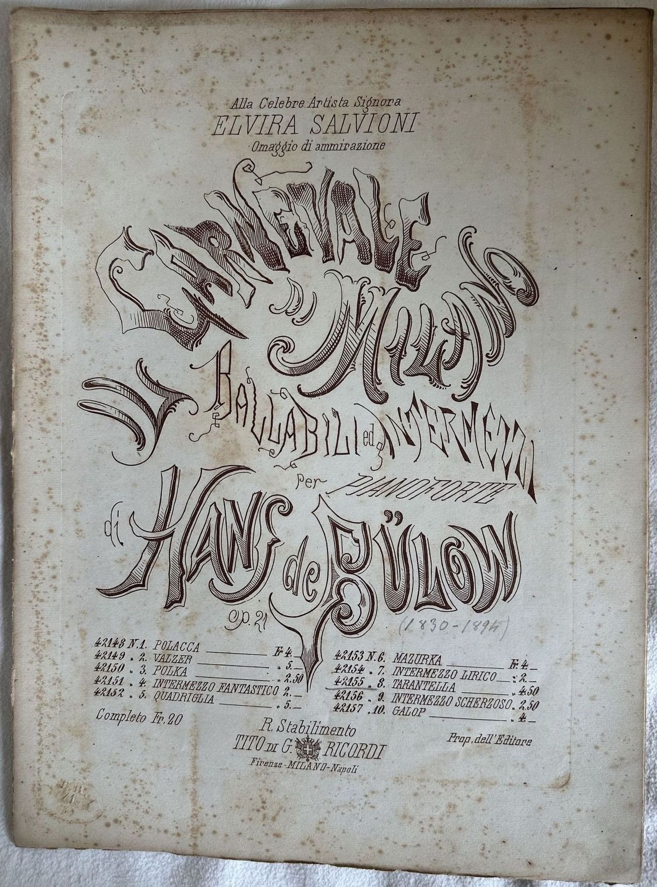 Edizione del marzo 1871 della melodia "Tarantella" dal "Carnevale di Milano" dell'opera 21 del compositore tedesco Hans Von Bulow (1830-1894). Bel frontespizio figurato. In buone condizioni. Copertina editoriale in buone condizioni con lievi usure marginali. Legatura in ottime condizioni. Pagine in buone condizioni con ioriture. In folio. cm. 35x26. Pp. 11.Edition of march 1871 of the melody "Tarantella" from "Carnevale di Milano" from the opera 21 by the german composer Hans Von Bulow (1830-1894). Beautiful figurated title page. In good conditions. Editorial cover in good conditions lightly worn in the extremities. Binding in very good conditions. Pages in good conditions with foxing. In folio. cm. 35x26. Pp. 11.