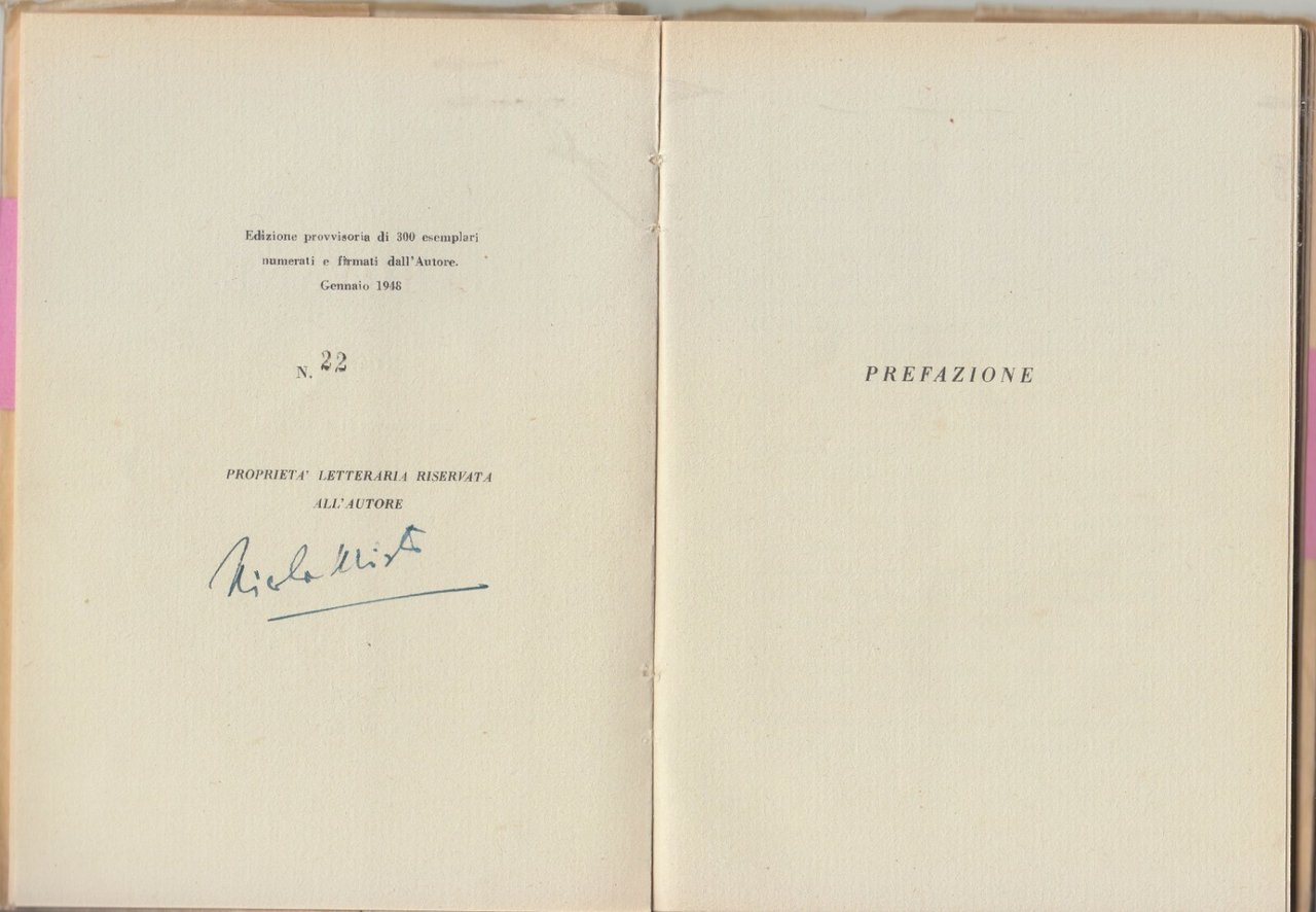 Edizione provvisoria di 300 esemplari numerati e firmati dall'autore (il nostro è il 22) Prefazione di Alberico Sala 70 pagine. copertina editoriale in brossura con sovraccoperta in carta oleata. Conserva la rara fascetta editoriale stato di conservazione: OTTIMO