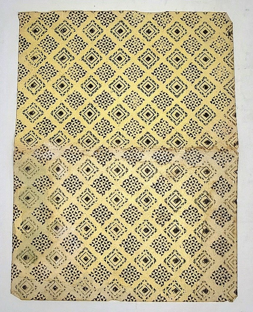 >Foglio (mm 200x275) di carta decorata e xilografata (carta domino). Motivo: quadrati di diverse grandezze e colori (verde e nero su fondo beige). Discretamente conservato, tracce di piega centrale, traccia di umidità nel piatto inferiore.