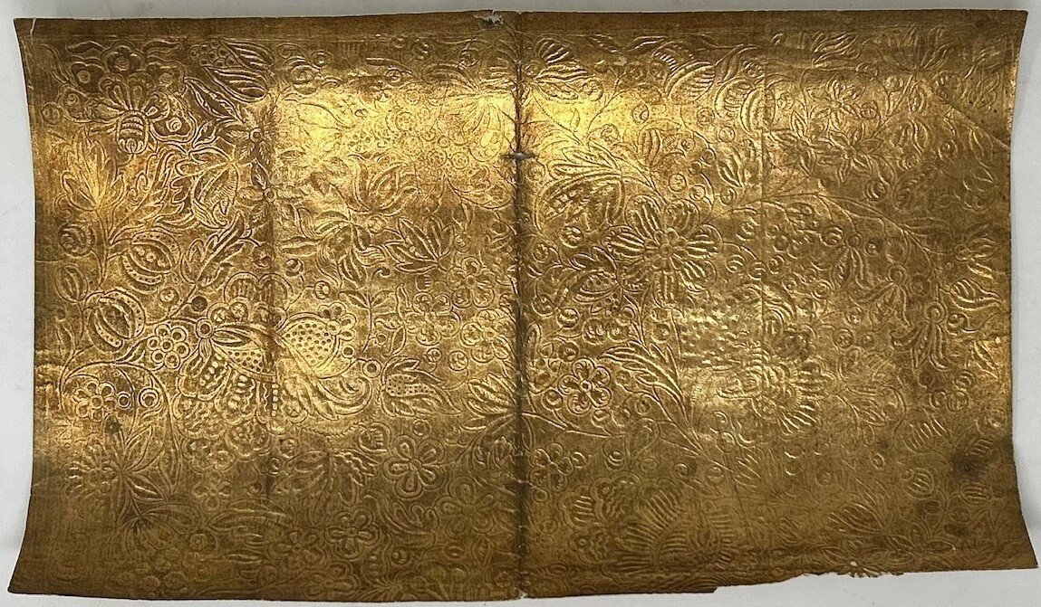 >Foglio a stampa (mm 320x195) con alternanza di superfici dorate incavate e superfici in rilievo. Disegno a grandi ramages fioriti con garofani e campanule etc. Traccia di antica piegatura e due piccolissimi forellini.