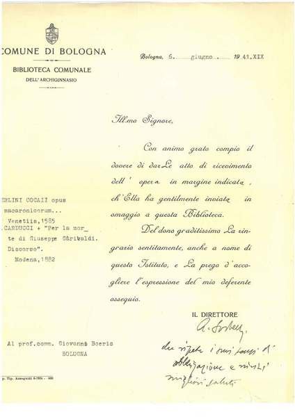 Carta intestata: "Comune di Bologna, Biblioteca comunale dell'Archiginnasio" datata, "Bologna, 6 giugno 1941"