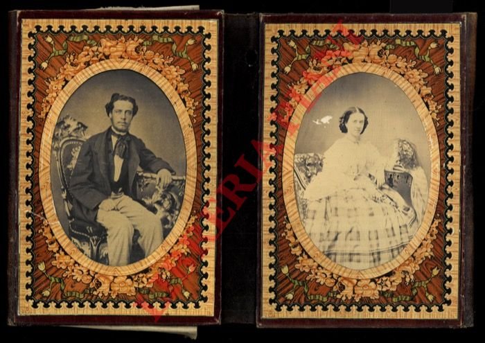 cm. 23 x 15, con tasche, e due bei ritratti (coppia borghese elegante). Tracce d'uso ma bell'oggetto.