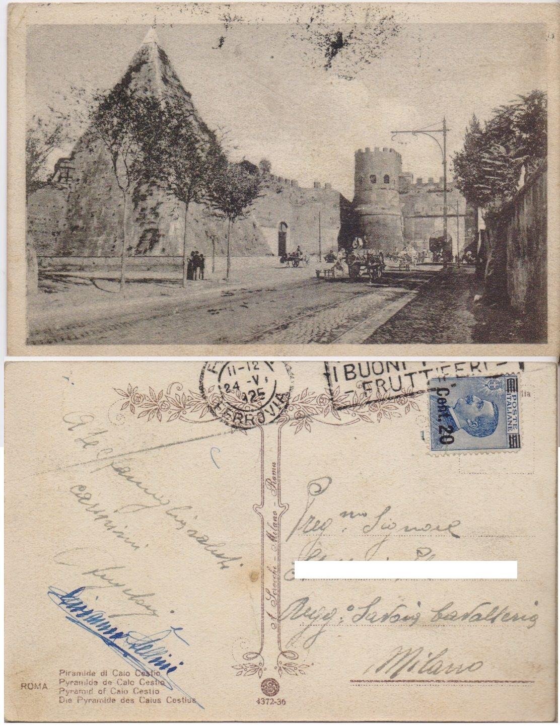 Cartolina - Roma. Piramide di Caio Cestio. Viaggiata 1925, animata, carri
