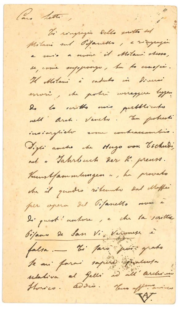 Mm. 80x138. Valli scrive al Setti, professore al Liceo di Siena, per ringraziarlo dello scritto di Luigi Adriano Milani sul Pisanello (Vittore Pisano detto Pisanello, in: “Protomoteca Veronese”, Verona, 1881) e lo invita a comunicare all'autore di correggere alcuni errori presenti nel testo, in particolare l'attribuzione di un quadro creduto autentico dal Maffei, ma provato non del Pisanello da Hugo von Tschudi.