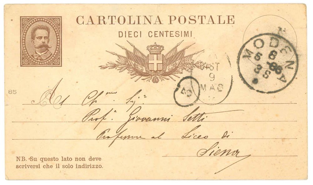 Cartolina autografa firmata con le iniziali AV ed indirizzata al Prof. Giovanni Setti a Siena. Modena, 8 maggio 1886