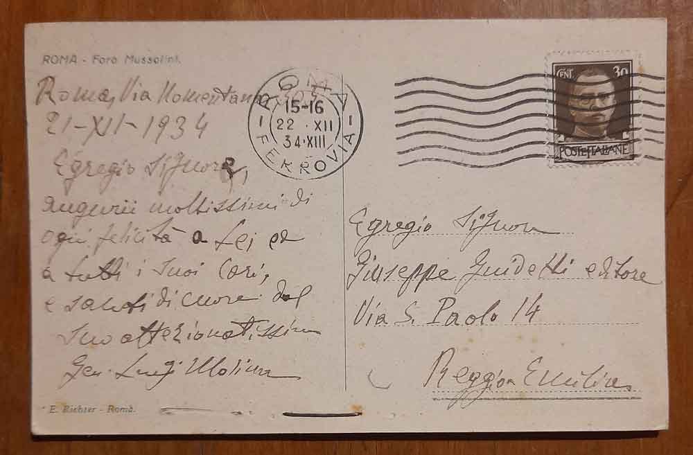 Cartolina con saluti del Generale Luigi Molina all'editore Giuseppe Guidetti