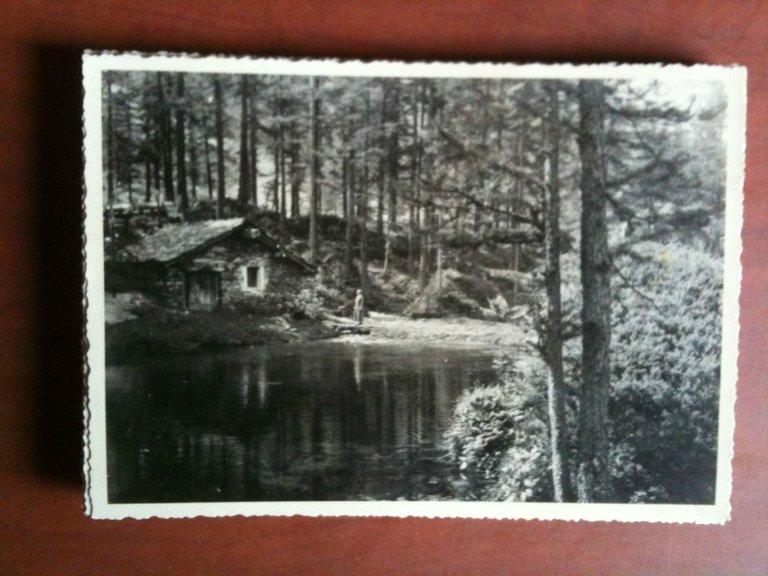 Cartolina fotografia vera anni '30 Baita su lago montano