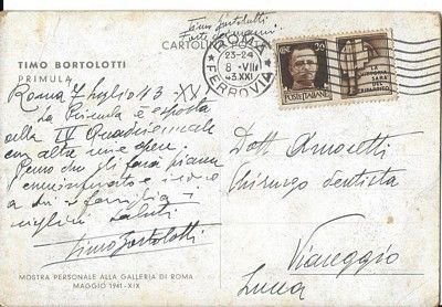 Cartolina viaggiata, facciata A:- Scultura (Primula) dell'autore, Facciata B:- Alcune righe dove scrive che la scultura è esposta alla quadriennale. firma Autografa -(Timo Bortolotti, vero nome Timoteo Bortolotti (Darfo, 15 giugno 1884 – Milano, 15 ottobre 1954), è stato uno scultore italiano). Marginali tracce del tempo.