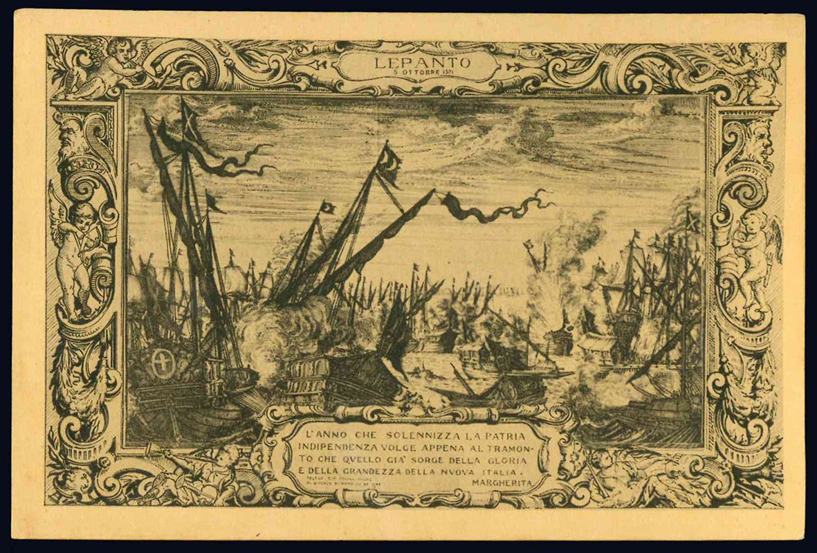 Cartolina in bianco e nero su carta panna (mm 92x138) nella quale è rappresentata la battaglia di Lepanto in cornice. Scritta ma non spedita.