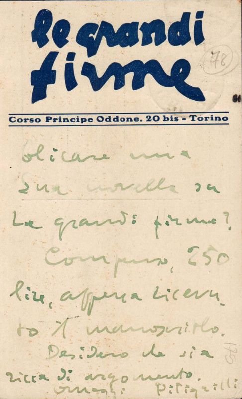 Cartolina manoscritta su due facciate e firmata. PITIGRILLI, pseudonimo di Dino Segre (Saluzzo, 9 maggio 1893 - Torino, 8 maggio 1975), è stato uno scrittore e aforista italiano. Ebbe un grande successo in Italia nel periodo tra le due guerre mondiali. Il suo nome è legato anche all'OVRA, la polizia politica fascista, di cui fu informatore e delatore.