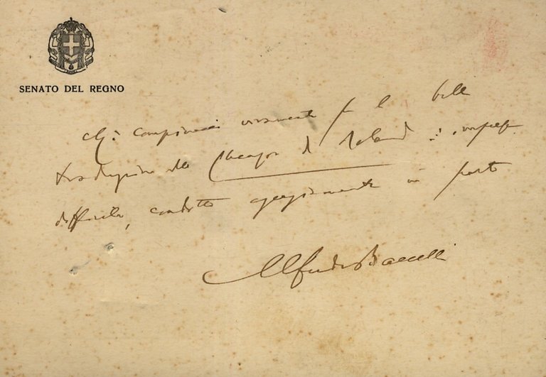 Cartolina postale manoscritta autografa, firmata, indirizzata a Elda Bossi, Ofiria Editrice. Intestata Senato del Regno, viaggiata, con timbro postale del 1938: "Mi compiaccio veramente per la bella traduzione della Chanson de Roland, impegno difficile. andato egregiamente in porto".