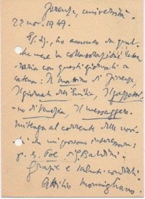 Cartolina postale viaggiata, autografa firmata, datata 22 novembre 1949 - Firenze, inviata ad Aldo Garzanti