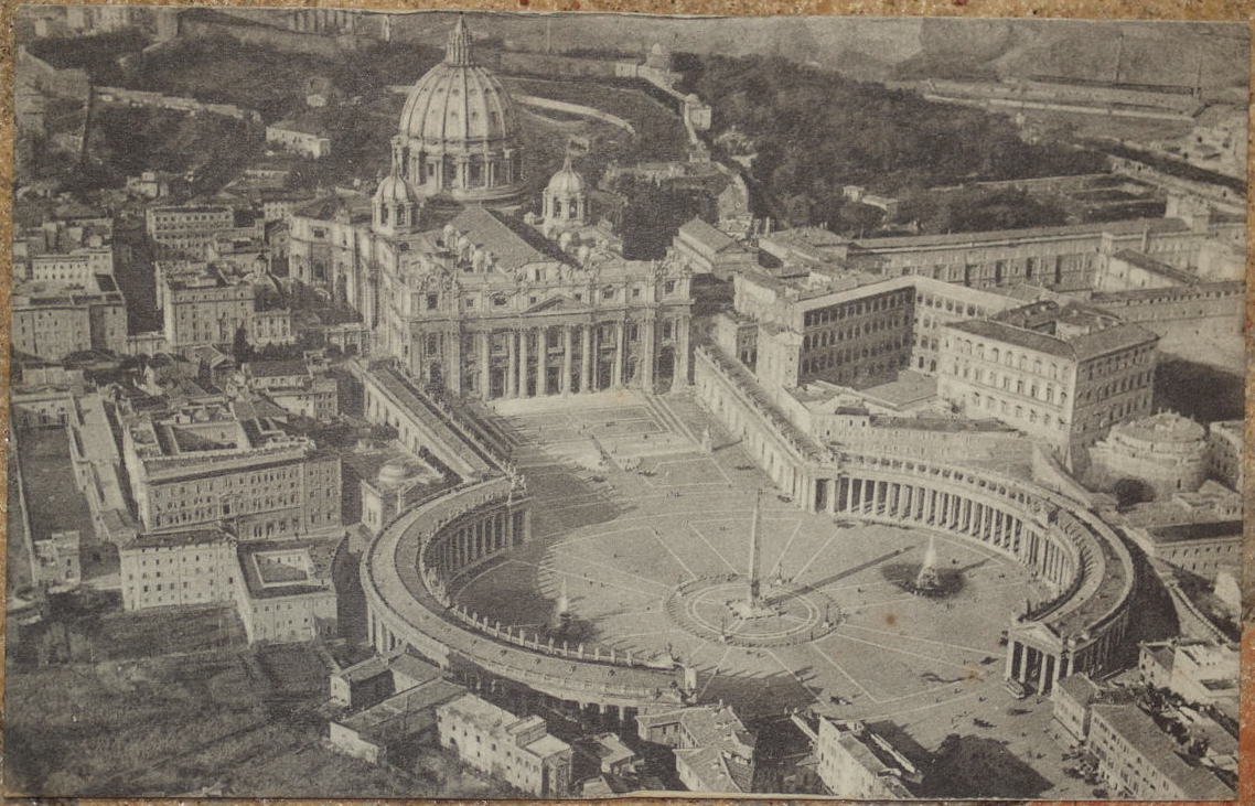 In 8. Dim. cm 9x14. Cartolina che mostra una veduta aerea della Basilica di San Pietro.Cartolina viaggiata (timbrata Roma 1933), è presente solo indirizzo ad una donna di Fermo ma nessun testo solo la data 24 aprile. In buone condizioni. Postal card showing a view of Rome Basilica di San Pietro. Travelled,(press Roma 1933), there is only the address to a woman a Fermo but no text only the date 24th of april. In good conditions.