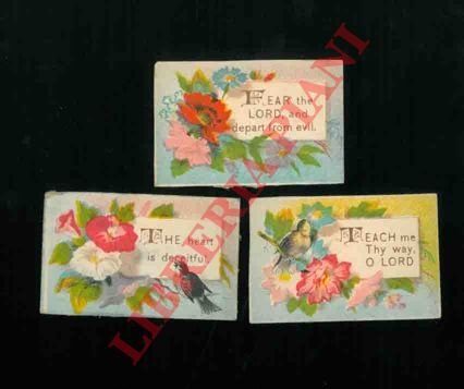 Lotto di venti (od uccellini) e versetti biblici in inglese, di cm. 4,5 x 3. Bellissimi.