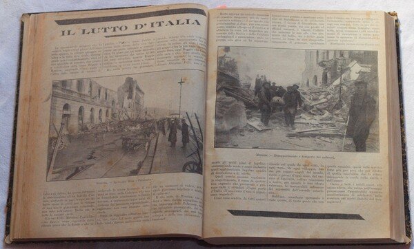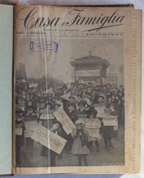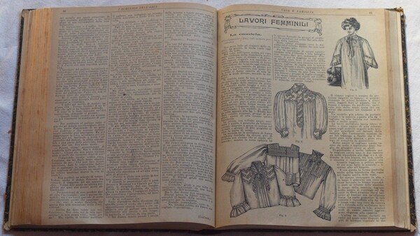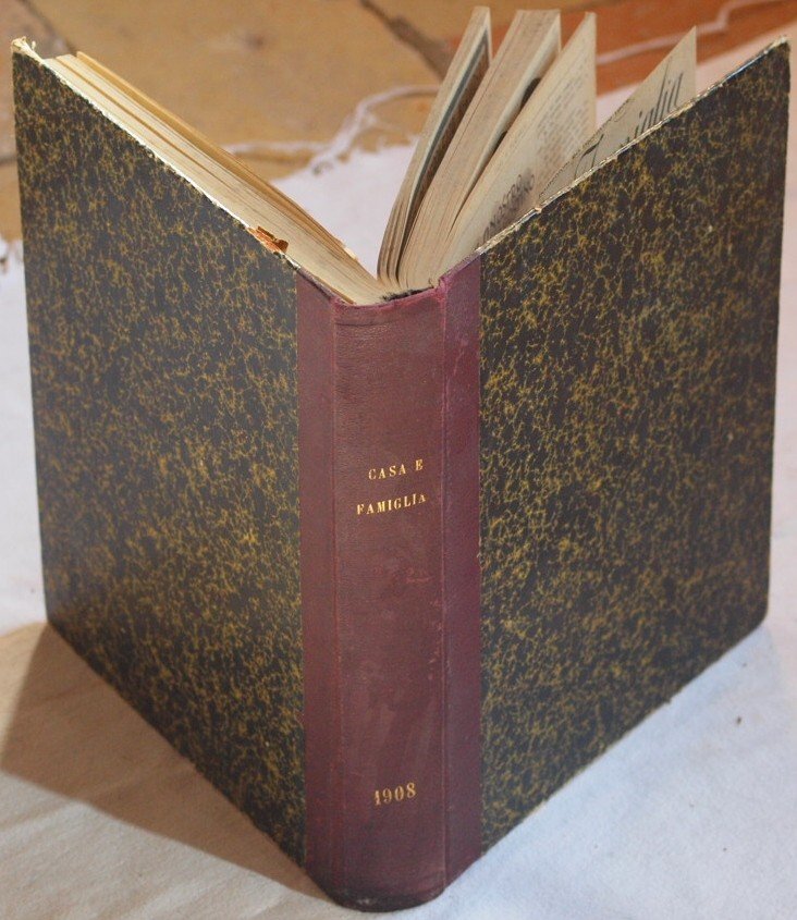 In 4. Dim. 28x22 cm. Pp. 704. Interessante raccolta di 22 numeri della rivista settimanale per signore "Casa e Famiglia". La raccolta comprende i numeri dal 20 Dicembre 1908 sino al 2 Maggio 1909, il numero del 13 Giugno 1909 e il numero del 25 Luglio 1909. La rivista forniva tutta una serie di consigli utili per la gestione della casa e per la bellezza, nonchè articoli vari (es. i nuovi giocattoli, doveri della padrona di casa, novelle, farmacia in famiglia, terremoto di Messina del 1908, belle maniere, museo di bambole a Parigi, giochi di prestigio, cure di bellezza, igiene del corpo, gatti, come una donna può guadagnarsi da vivere ecc.). In ogni numero una parte dedicata al fai da te con lezioni e schemi di cucito e ricamo (corredo del neonato, toeletta da battesimo, salottino della bambola, camicia ricamata per neonato, colletti per signora, sottobicchieri con ricamo inglese, copertine per vassoio, ecc.), alla cucina con numerose ricette e foto per preparazioni (lepre allo spiedo, pilat, filetto di manzo alla giardiniera, croquettes di bollito, piccioni all'inglese, bollito di manzo guarnito ecc.) Presente inoltre il romanzo a puntate (completo, 4 pagine in ogni numero) "I Robinson dell'aria" del Capitano Grant e il fumetto "Le avventure di Bel Tomo. Numerose foto d'epoca e illustrazioni all'interno, pubblicità d'epoca. In buone condizioni. Copertina in mezza tela con titolo in oro al dorso in ottime condizioni generali con lievi usure ai margini e dorso. Legatura in buone condizioni. All'interno le pagine si presentano in ottime condizioni con rare fioriture. Interesting collection of 22 nubers of the weekly magazine for ladies "Casa e Famiglia".<BR> The collection inclueds numbers from the 20th of December 1908 until the 2nd of May 1909, the number of the 13th of June 1909 and the number of the 25th of July 1909. The magazine provided all a series of useful suggestions for the managemnt of house and beauty, different articles (eg. the new games, duties of the owner of house, short novels, drugstore in house, earthquake of Messina of 1908, beautiful manners, doll's museum in Paris, prestigious games, care of beauty, hygiene of body, cats, how a woman can gain ecc.).<BR>In each game a part dedicated to sewing and embroidery (baby, toeletta of baptism, doll's house, under glass with english embroidery etc.), kitchen with different recipes and photographa of preparations (lepre allo spiedo, pilat, filetto di manzo alla giardiniera, croquettes di bollito, piccioni all'inglese, bollito di manzo guarnito ecc.) There is also the instalment novel (complete, 4 pages in each number) "I Robinson dell'aria" by Capitano Grant and the comic strip "Le avventure di Bel Tomo". Different photoes of that time and advertisings. In good conditions. Half cloth cover with golden title in the spine in very good general conditions slightly worn in the edges and spine. Binding in good conditions. Inside pages are in very good conditions with occasional foxings.