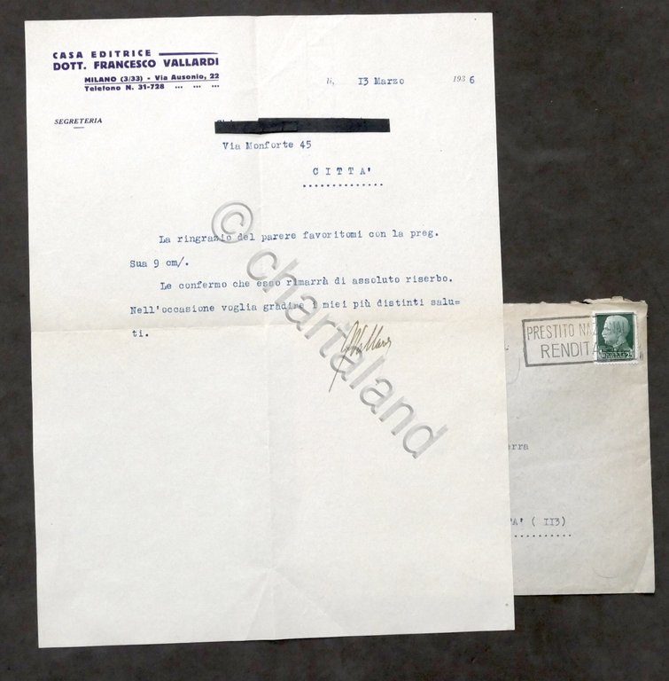 Casa Editrice Francesco Vallardi - marzo 1936 - Autografo G. Vallardi su lettera dattiloscritta datata 13 marzo 1936. Un foglio, dimensioni: 20 x 27 ca. Condizioni molto buone. Con busta di spedizione allegata.