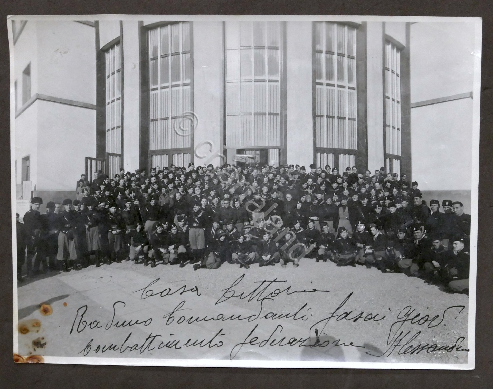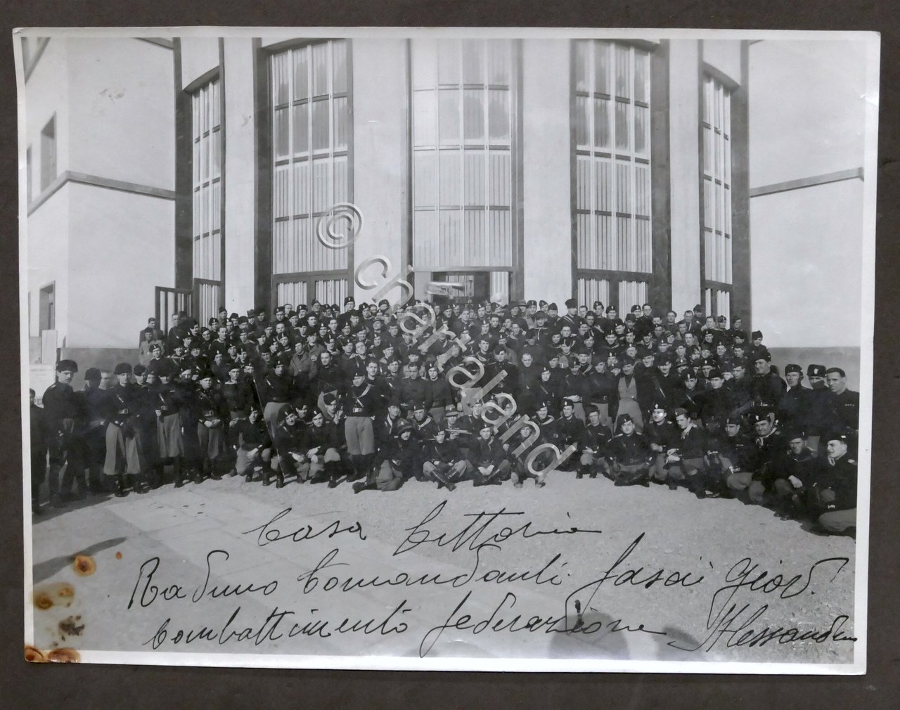 Casa Littoria di Alessandria - Fotografia Raduno Comandanti Fasci Giovanili di Combattimento - anni '30 Dimensioni: 17 x 23 cm ca. Buone condizioni generali. Piccole macchie all'angolo inferiore sinistro e leggere pieghe.