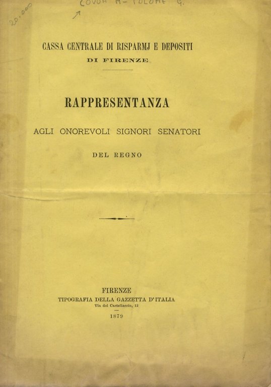 Cassa Centrale di Risparmi e Depositi di Firenze. Rappresentanza agli onorevoli signori senatori del regno.